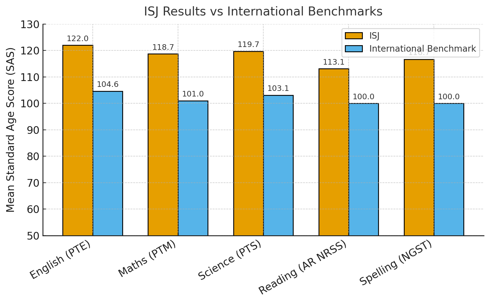ISJ’s 2025 results, ranging from 113 to 122 across English, Maths, and Science, therefore align directly with the upper range of leading British prep schools and surpass the performance of most international schools in the region.